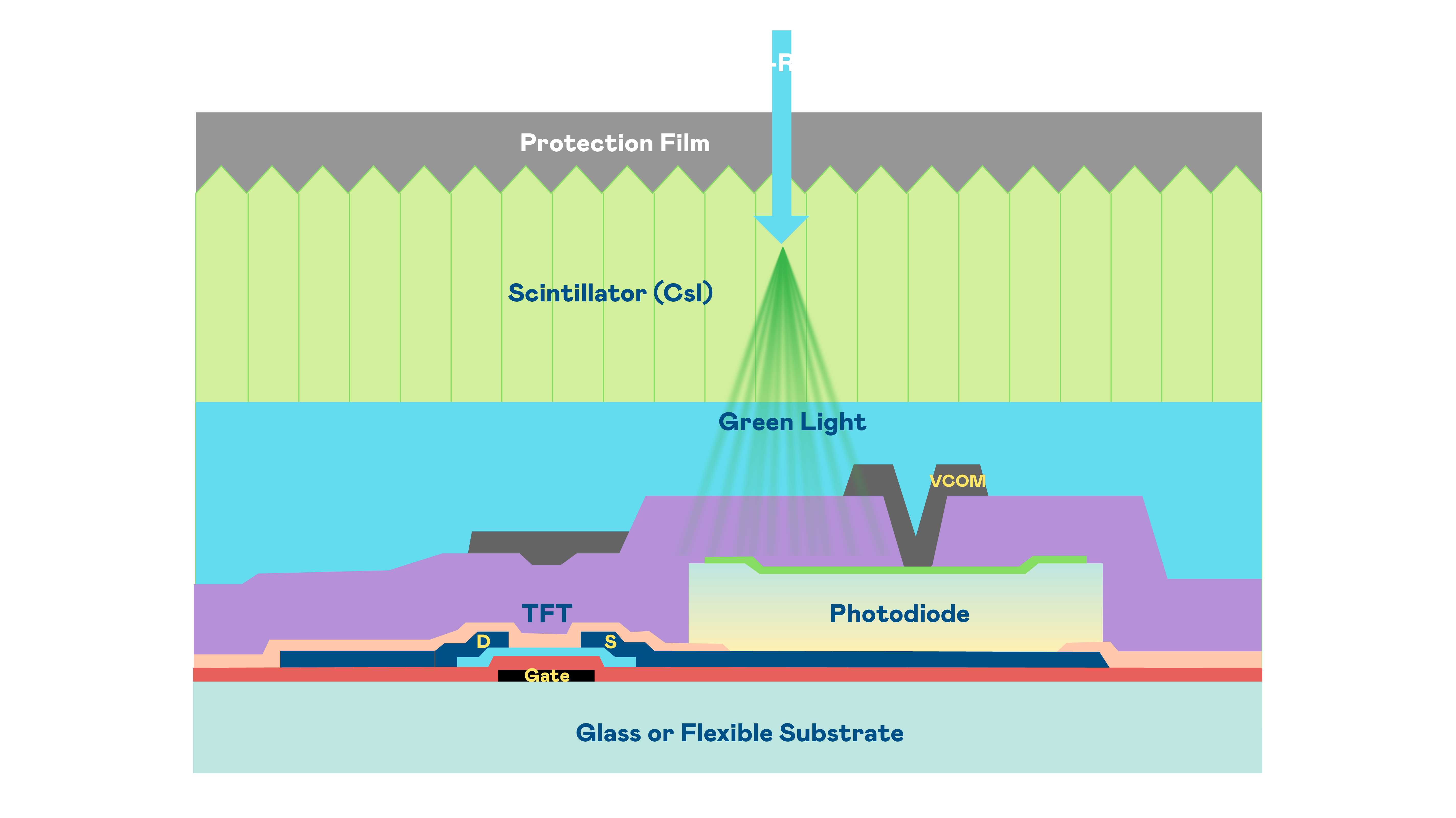 PA真人的X光影像感测阵列使用薄膜电晶体 (TFT) 作为每个像素的读取开关,搭配光电二极体(Photodiode)的光电转换元件,用以感测X光影像讯号。